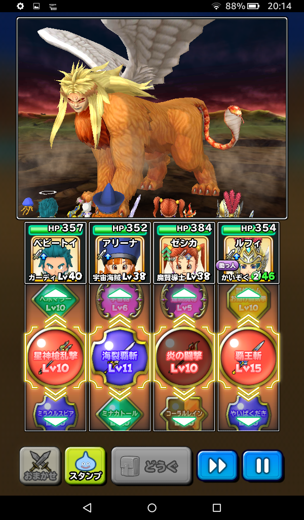 獣迅風撃はバギ系全体攻撃、獣王の咆哮は無属性全体攻撃で守備力ダウンです。